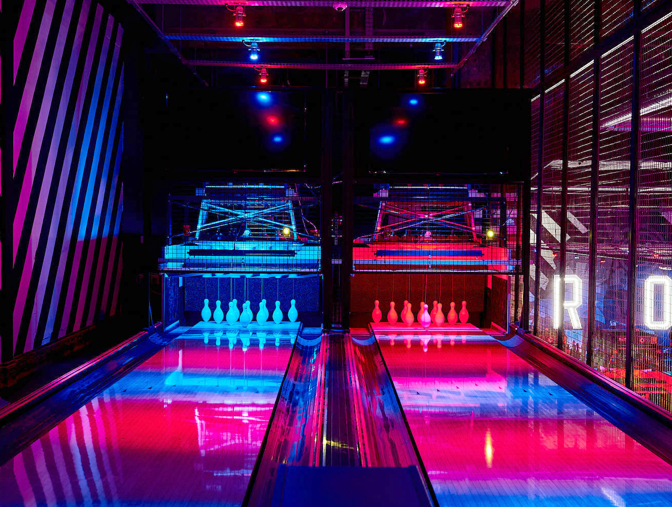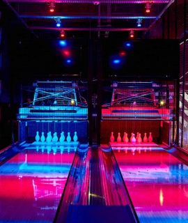 The new Nottingham venue is Roxy’s largest venue covering an area around 25,000 square feet (2300 sqm). Nottingham has 6 full size Tenpin lanes split into a 2 lane area below a mezzanine with bespoke pedestal mounted scoring monitors because of the limited headroom and a 4 lane section.